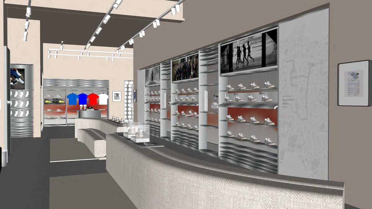 2階にはランニング、トレーニング、フットボール、スケートボードなど、パフォーマンスカテゴリーを集約。ダイナミックなランニングシューズウォールや、協賛マラソン大会のコースマップ展示など、インスピレーションを刺激する空間で、初心者から上級者までの幅広いニーズに応える。