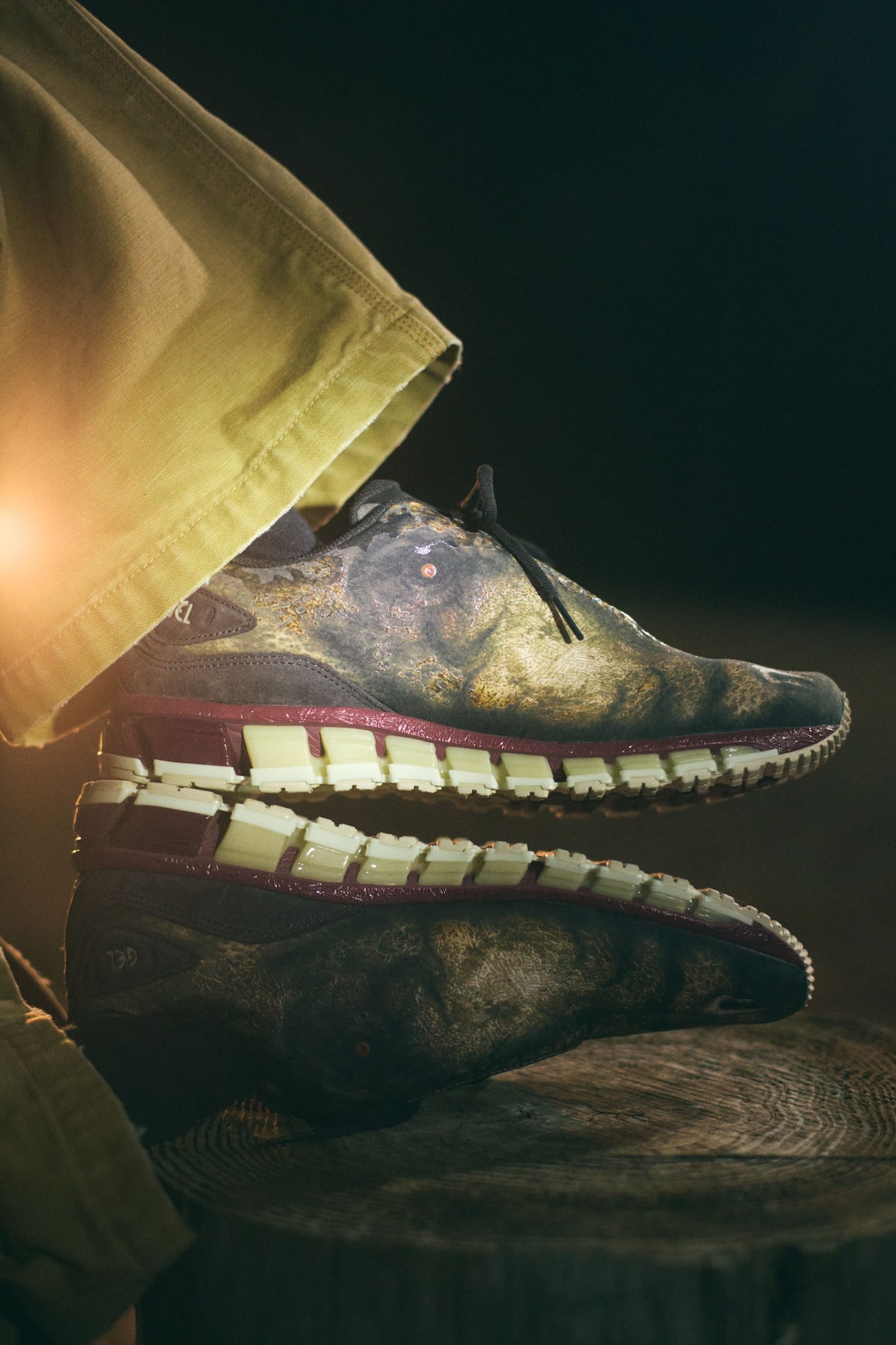 ソール部分は、恐竜の歯や歯茎を彷彿とさせる配色で構成。両足のかかとを揃え、つま先を動かすことで、まるで恐竜が口を動かしているかのような視覚的ギミックも仕込まれている、遊び心に満ちたデザインだ。