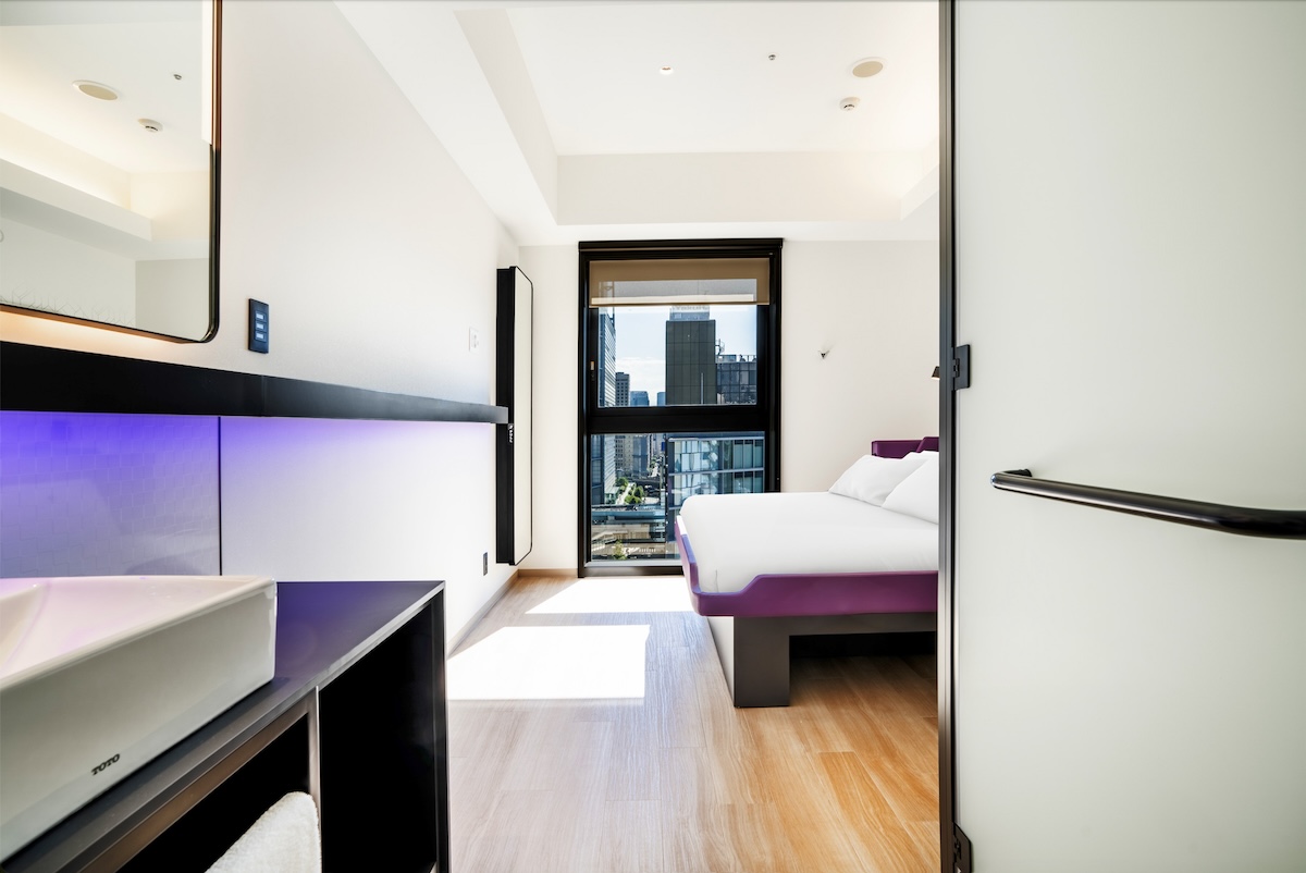客室は無駄のないミニマルなデザインだが、スタイリッシュなムードが漂い、大きな窓から銀座の街並みや新幹線が走る風景が見える解放的な作りに。さらにはミネラルウォーターやタオルなどのアメニティを届けてくれるロボットクルーなど、機能性の中にさりげないプレミアム感と、「YOTEL」らしさが織り込まれている。