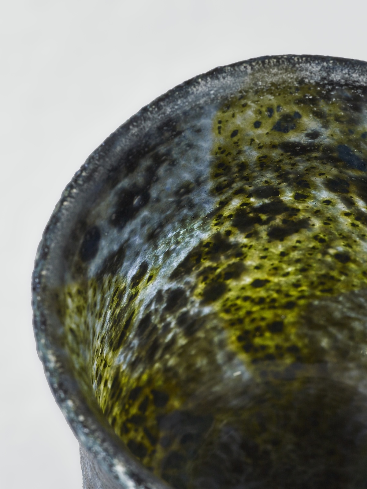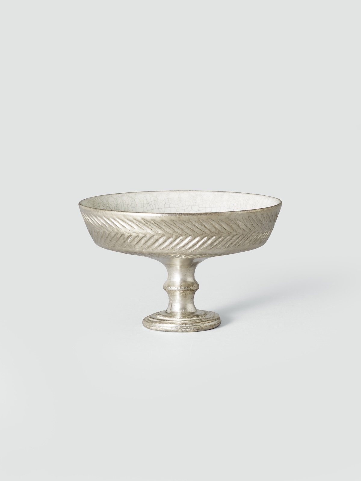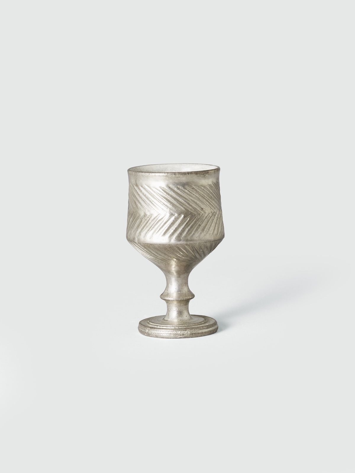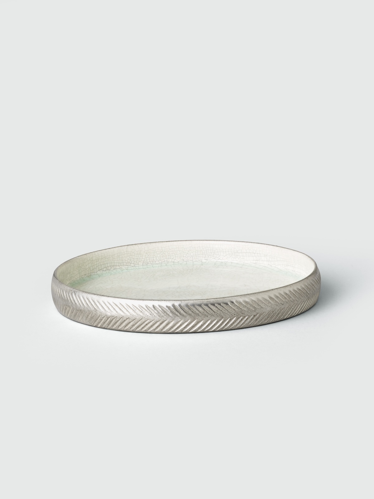 陶芸家・谷井直人の作品は銀彩を施した器を中心に、光と影を受け止めながら静かに表情を変える質感と、どこか古物を思わせる佇まいが魅力だ。