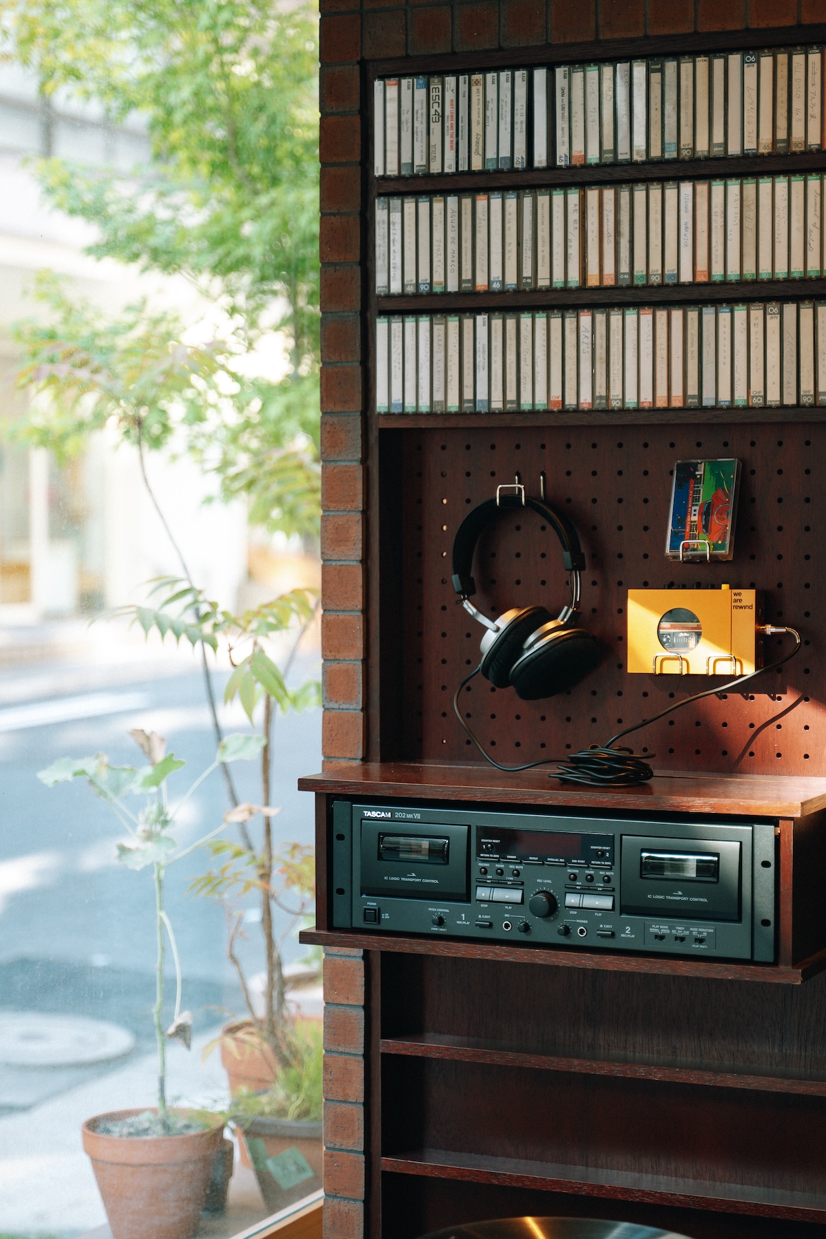 個人的に目を引いたのが、ヴィンテージのカセットプレーヤー。カセットは1階でレンタルができるので、その日の気分に合わせて好きな音楽を部屋に“持ち帰る”、少しの非日常も味わえる。この日はちょうど前日に買ったカセットを持ち込んで夜を過ごした。