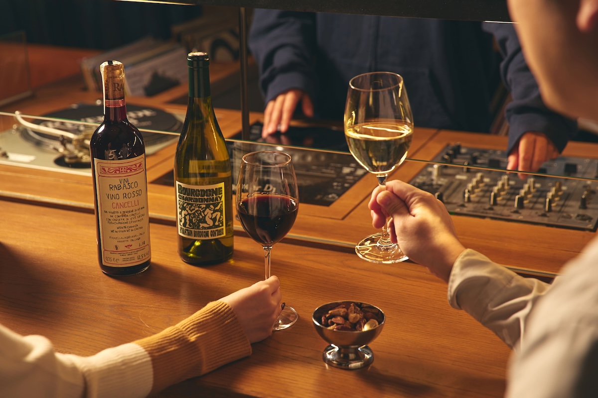 今回のリニューアルの核となるのが音響設備だ。ラウンジエリアには、バーチ合板の特性を生かした大型スピーカーを特注で導入。最新のアナログレコードプレイヤーとCDJを備えたDJブースを中心に据え、営業中はアナログレコードならではの温かみのある音が空間全体を包み込む。さらに、店内にはアナログレコードの試聴席が設けられ、中目黒のレコードショップ「Adult Oriented Records(アダルトオリエンテッドレコーズ)」がセレクトしたレコードを自由に楽しめる、新たな音楽体験を提案する。
