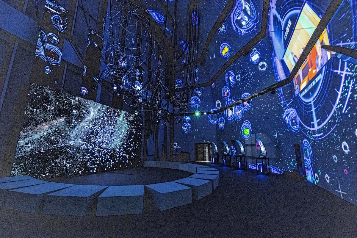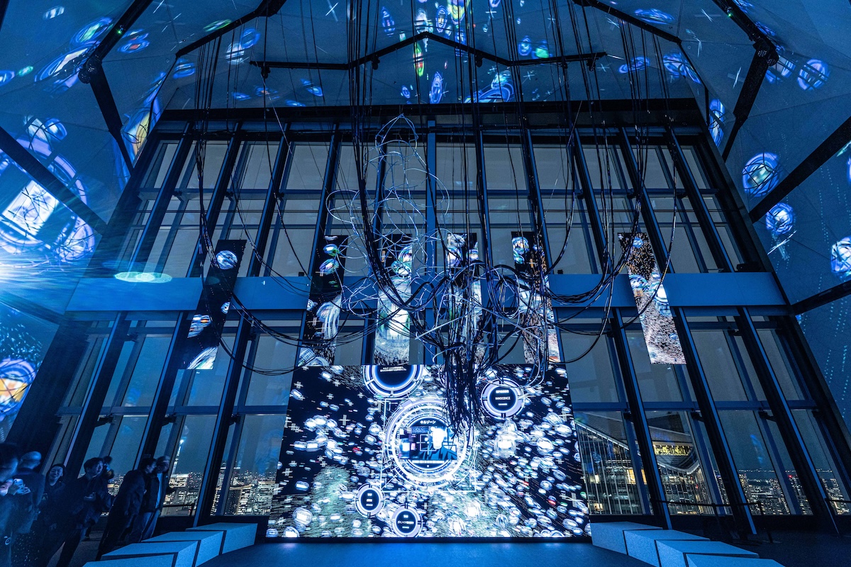 まず会場に足を踏み入れると、『攻殻機動隊』の情報ネットワークへ接続する“NODE(思考の結節点)”へと導かれ、アーティスティック・ディレクター松山周平による巨大インスタレーション『Nerve Net』が、電脳空間へと“ダイブ”する感覚を生み出す。続く寺山紀彦による『World Tree: Ghost and the Shell』では、天井高15メートルの闇から無数のケーブルが垂れ下がり、作中の“有線接続”を想起させる象徴的な光景が立ち上がる。