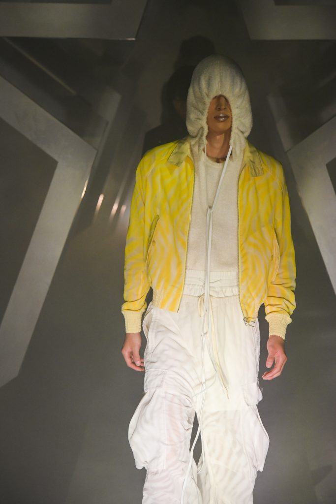 さよう、MASUの服は20代が作る服にしては珍しく“基本の型”がある。フライトジャケット、テーラードジャケット、ライダースジャケットといったベースの長所と短所を考察し、現代にあった基本に置き換える。そこからさらに自由な発想でアレンジを加える。それがMASUの骨子だ。2022SSのテーマは“silver lining in the cloud”。「自分がもっと未来を楽しみにしていたのはいつだったのか?」という問いからスタートしたコレクションで、1970年代のファッションに夢中だった青春時代を表現したという。写真で見るかぎりではファーストショーより全体がまとまっていて初期衝動のようなものが上手く表現できているし、これまでのジェンダーレスな匂いが薄まって力強さを増している。